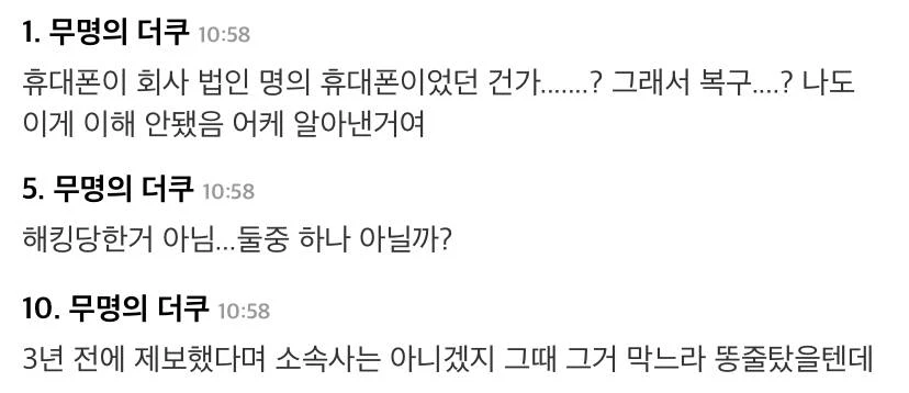 온라인 커뮤니티 '더쿠' 이용자들은 "휴대폰이 회사 법인 명의 휴대폰이어서 복구한 건 아니냐", "해킹당한 거 아닌가", "3년 전 제보 받은 거라면 지금 분쟁 중인 소속사는 아닐 것 같다"며 유출설에 힘을 싣고 있다.