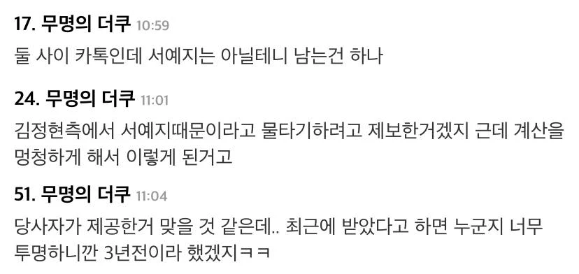 이에 비해 다른 이용자들은 "둘 사이 대화인데 서예지가 아니면 남는 건 하나 아니냐", "김정현 측에서 서예지 때문이었다고 제보한 건데 계산을 잘못해서 이렇게 된 것 같다", "당사자가 제공한 건데 최근에 받았다고 하면 누군지 너무 티 나니까 3년 전이라고 한 거 아니냐" 등 김정현 측이 제보한 것이라는 의견도 줄을 이었다.
