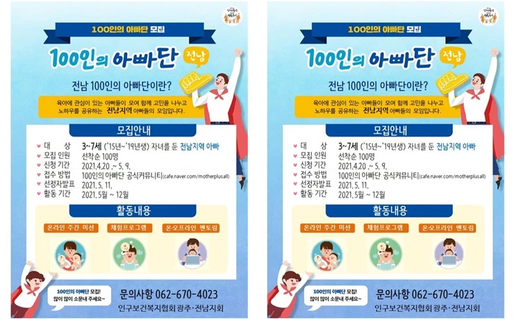 참가 신청은 5월 9일까지 네이버 카페 ‘100인의 아빠단 공식 커뮤니티’(https://cafe.naver.com/motherplusall)에 하면 된다. 전남도는 5월 11일 커뮤니티 공지사항에 선정자를 발표할 예정이다.