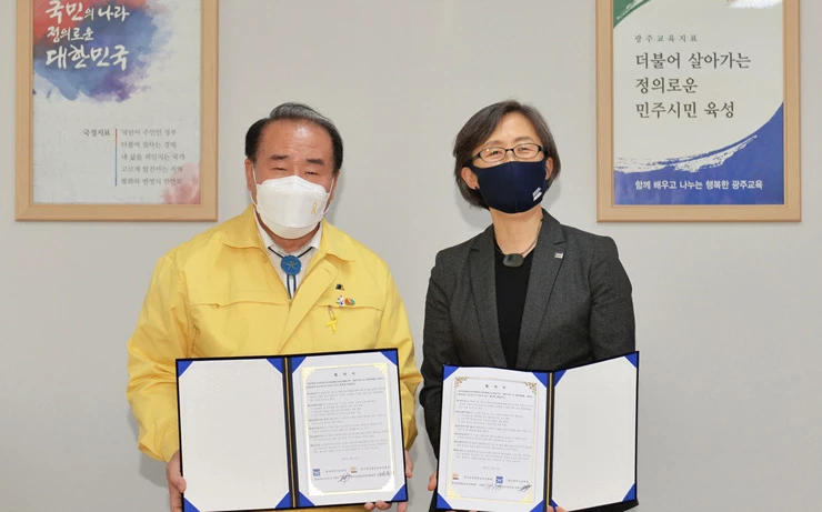 광주시교육청이 21일 교육감실에서 여성가족부 산하 한국양성평등교육진흥원과 교원 및 학교현장의 성인지력 제고와 성평등 의식 향상을 위한 업무협약(MOU)을 체결했다.