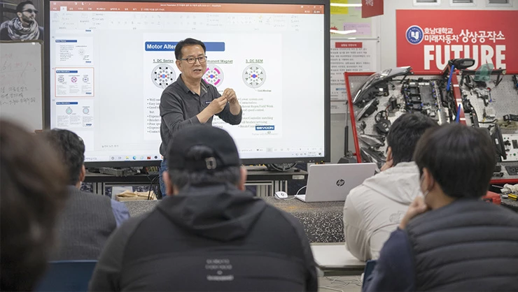 미래자동차공학부는 실제 전기차 부품을 가지고 교육자료로 쓸 수 있게 만든 이 장비를 도입함과 동시에 세브콘코리아 윤상순 대표이사를 초청, 전기차의 모터 구동 원리, 배터리 충전 방전 원리 등 장비 사용 교육과 함께 전기차 시장 전망과 활용 분야 강의를 진행했다.