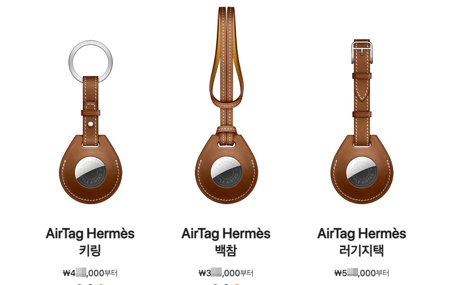 애플은 지난 20일(현지시각) 발표한 위치 추적 기반 장치 '에어 태그' 액세서리에서도 에르메스 케이스를 선보였다. 가방에 달 수 있는 '백참'은 30만 원대, 키링은 40만 원대, 그리고 러기지택은 50만 원대다.