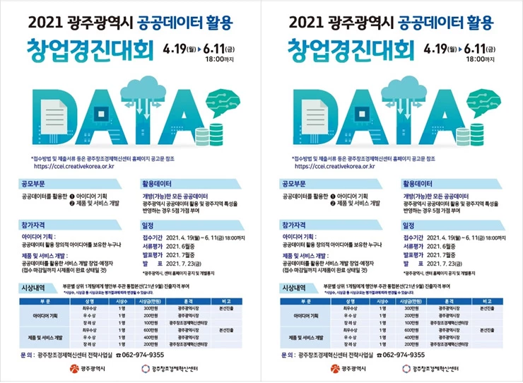 광주시가 주최하고 (재)광주창조경제혁신센터가 주관하는 이번 창업경진대회의 공모분야는 아이디어 기획과 제품 및 서비스 개발 2개 부문으로 공공데이터를 활용한 창의적인 아이디어를 보유한 누구나 참가할 수 있다.