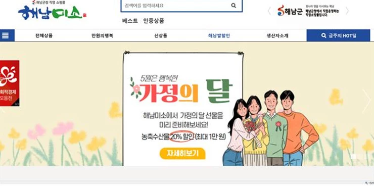 해남군 쇼핑몰 해남미소는 5월 가정의 달을 맞아 5월 21일까지 농수축산물 할인 행사를 진행한다.