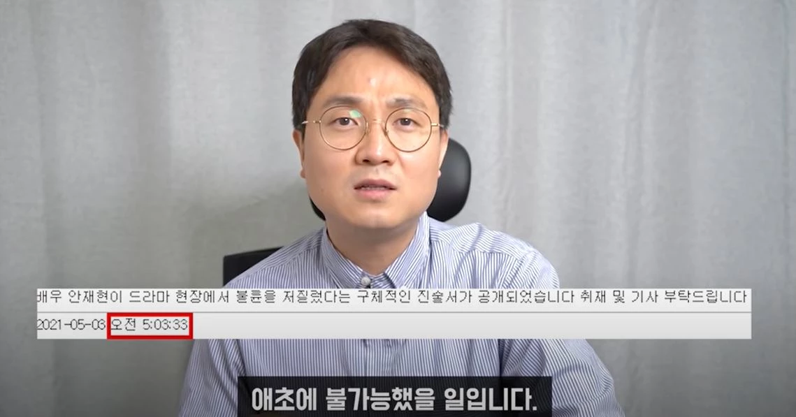 그는 처음 온라인 커뮤니티에 글이 올라온 것에 대해서도 미심쩍어했다. 이진호는 "해당 글이 올라온 지 몇 분도 안 돼 기자들에게 제보 메일이 왔다. 미리 기자 리스트를 파악하고 있는 사람이 벌인 게 아니라면 불가능했을 것"이라 분석했다.