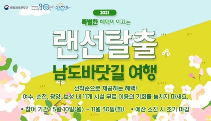 특별한 혜택이 이끄는 6권역 남도바닷길 프로모션은 개별 여행객들에게 광양, 여수, 순천, 보성 4개 시군의 공공 및 민간 11개 관광시설 무료 이용권을 제공하는 특별이벤트이다.