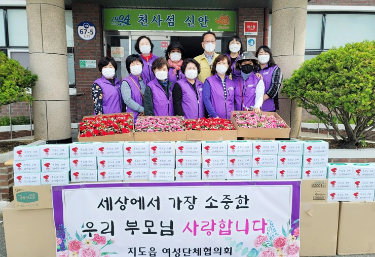 신안군 지도읍 여성단체협의회(회장 김영례)는 7일 어버이날을 맞이하여 1004섬 신안군 지도읍을 평생토록 지켜오신 지역 어르신들에 대한 존경과 감사의 마음을 전하기 위해 정성껏 마련한 카네이션을 달아드리고 마스크를 전달했다.