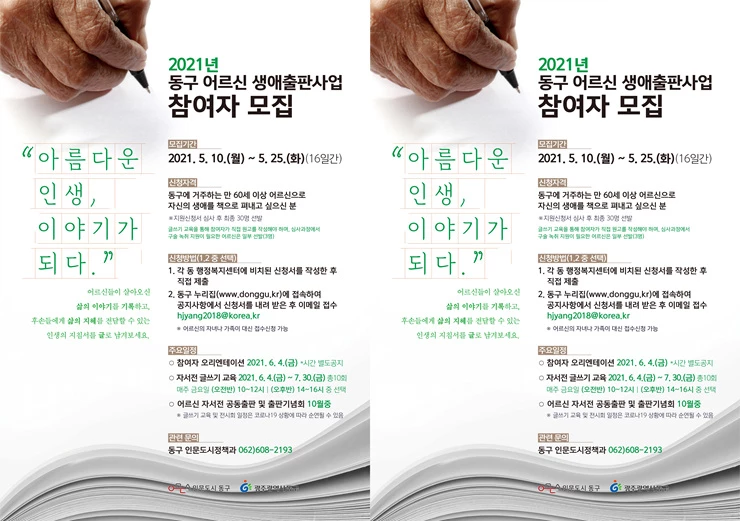 광주시 동구(청장 임택)는 어르신들의 삶을 재조명해 이를 자서전으로 출판하는 ‘2021년 생애출판 사업’ 참여자를 오는 25일까지 모집한다고 밝혔다.