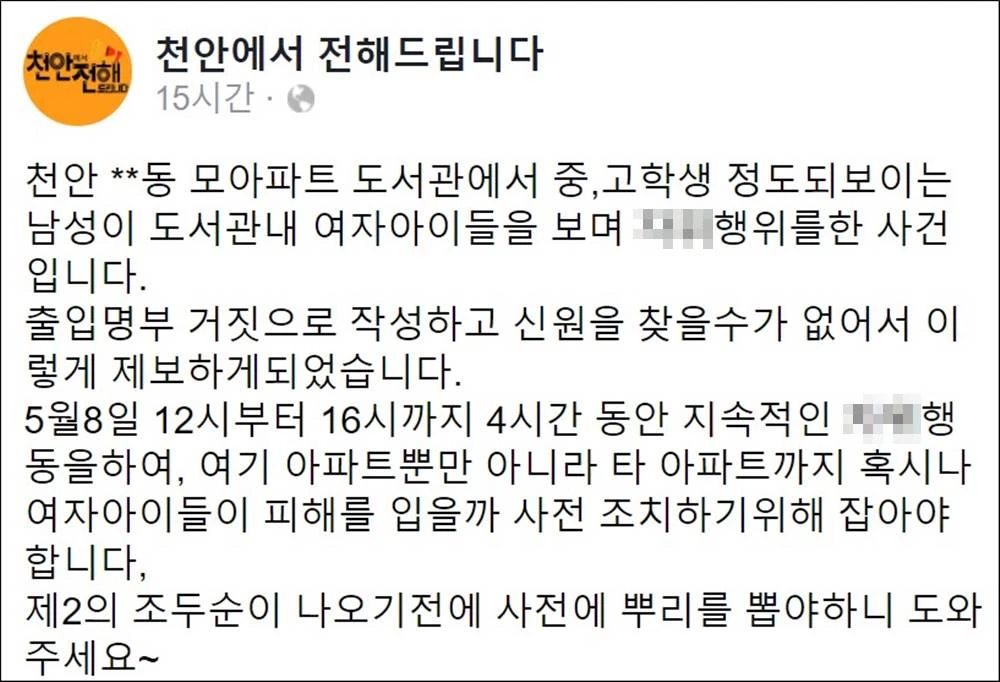 제보자는 "천안 **동 모 아파트 도서관에서 중·고등학생 정도 돼 보이는 남성이 도서관 내 여자아이들을 보며 OO 행위를 한 사건이다"라고 설명했다.