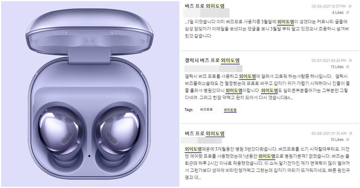 앞서 삼성전자 커뮤니티 '삼성 멤버스'에서는 지난 3월부터 다수의 갤럭시 프로 사용자가 외이도염 감염을 호소하고 있다는 사실이 알려졌다. 이들은 공통적으로 갤럭시 버즈 프로 이어 팁이 닿는 부분에 진물이 나고 염증과 딱지, 가렵고 붓는 증상을 설명했다.