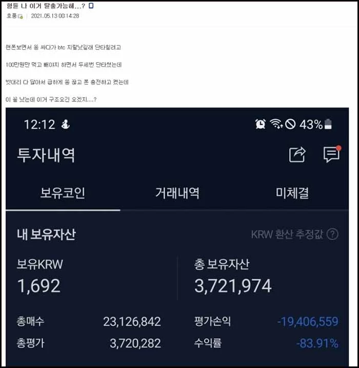 4000만원 넘게 날린 투자자는 “휴대폰 보면서 큰일을 보다가 비트코인이 급락하기에 ‘100만원만 먹고 빼야지’ 마음 먹고 단타를 쳤다. 두 세 번 단타를 쳤는데 배터리가 다 닳아서 급하게 화장실에서 나와 휴대폰을 충전하고 켰는데 이 꼴이 났다”라면서 투자 상황을 인증했다.