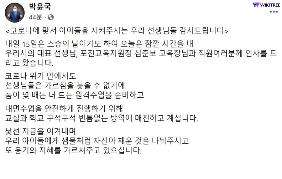박윤국 포천시장은 14일 오후 "코로나19에 맞서 아이들을 지켜주시는 우리 선생님들 감사드린다"는 글을 자신의 페이스북 계정을 통해 게시했다.