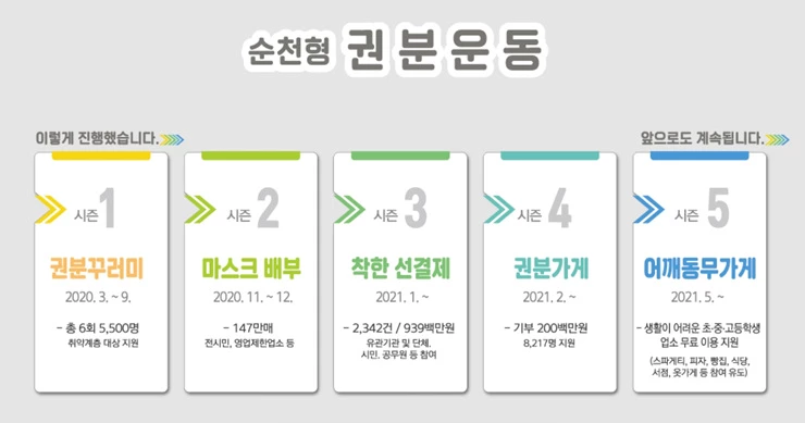 한편, 순천형 권분운동은 코로나19로 무료급식이 중단되자 끼니를 걱정하는 이웃을 돕자는 권분꾸러미 전달을 시작으로, 전 시민 마스크 권분운동, 착한 선결제 운동, 권분가게까지 성공적으로 추진하며 범시민운동으로 확산되고 있다.