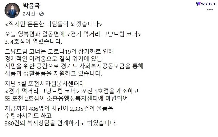 박윤국 포천시장은 17일 오후, '포천시 관내 영북면과 일동면에 <경기 먹거리 그냥드림 코너> 3, 4호점이 열렸다'는 글을 자신의 페이스북 계정을 통해 게시했다.