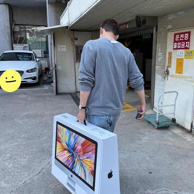 글과 함께 올라온 사진에는 오상진이 한 상가 건물 앞에서 애플 데스크톱을 들고 있는 모습이 담겼다.