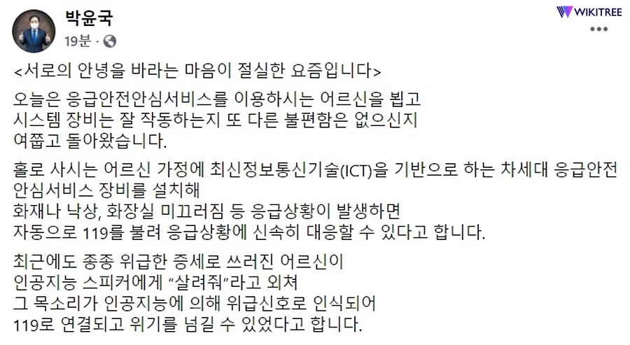 박윤국 포천시장은 20일, 자신의 페이스북 계정을 통해 "코로나19로 인한 비대면과 거리두기의 세상에서 홀몸어르신분들이 누구보다도 힘든 하루하루를 견디고 계실 것"이라면서 "응급안전안심서비스를 이용하시는 어르신을 뵙고 시스템 장비는 잘 작동하는지 또 다른 불편함은 없으신지 여쭙고 돌아왔다"는 글을 게시했다.