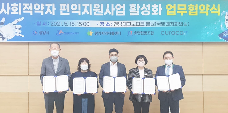 광양시(시장 정현복)는 (재)전남테크노파크, 광양지역자활센터, 휴먼협동조합, ㈜큐라코와 ‘배설 케어 로봇의 운용 활성화를 위한 업무협약’을 지난 18일 전남테크노파크 본원에서 체결했다.