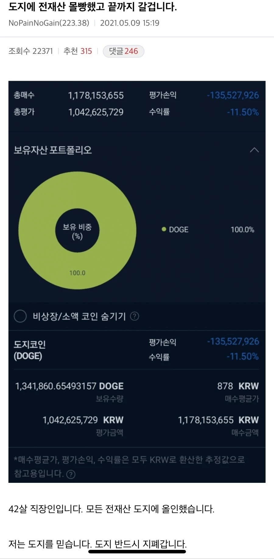 도지코인에 전 재산 11억7000만을 몰빵한 직장인의 살벌한 근황