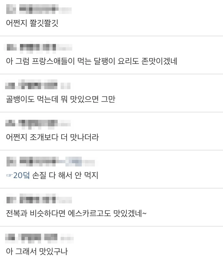 이를 본 네티즌들은 "전복이 맛있는 것처럼 프랑스 달팽이 요리도 맛있을 것 같다", "어쩐지 조개보다 전복이 더 맛있더라", "골뱅이, 고둥, 소라, 우렁이 다 복족강이니 상관없다" 등 다양한 반응을 보였다.