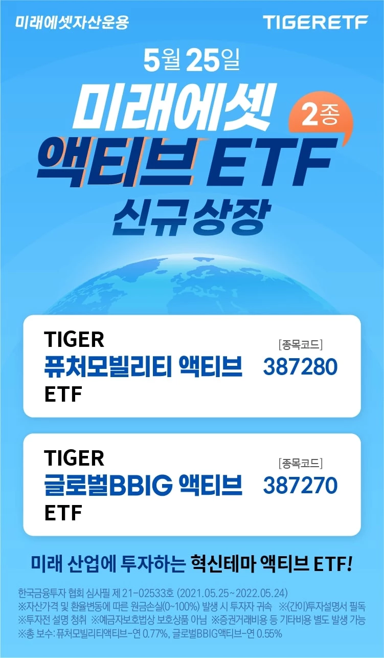 미래에셋자산운용은 전날 신규 상장한 TIGER 액티브 ETF(상장지수펀드) 2종 거래고객을 대상으로 이벤트를 진행한다고 26일 밝혔다. 신규 상장하는 ETF는 'TIGER 퓨처모빌리티 액티브 ETF'와 'TIGER 글로벌BBIG 액티브 ETF'다.