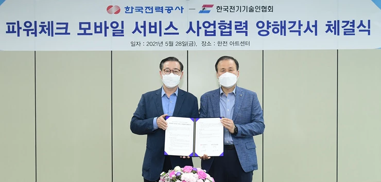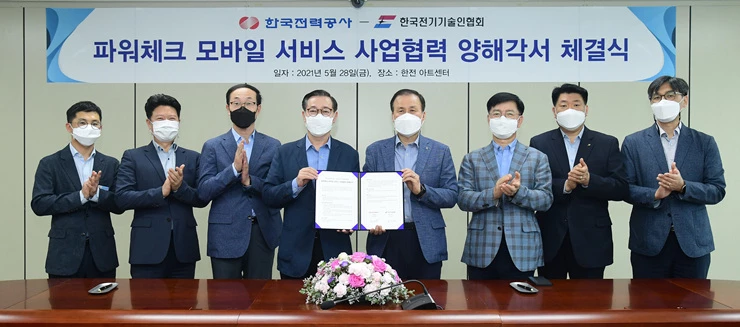 한국전력(대표이사 사장 김종갑)은 한국전기기술인협회와 5월 28일 한전 아트센터에서 김태용 한전 디지털변환처장과 남기범 한국전기기술인협회 경영관리본부장 등 10명이 참석한 가운데 「파워체크 모바일 서비스」 사업협력 MOU를 체결했다.