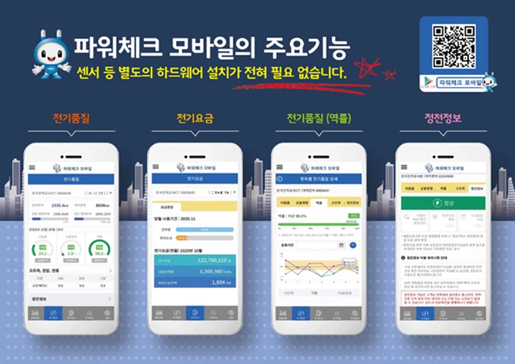 파워체크 모바일 서비스는 빌딩, 공장, 상가 등 대형 전력설비 운영에 필요한 전기품질, 전기안전 정보를 핸드폰 앱으로 제공하는 솔루션이다.