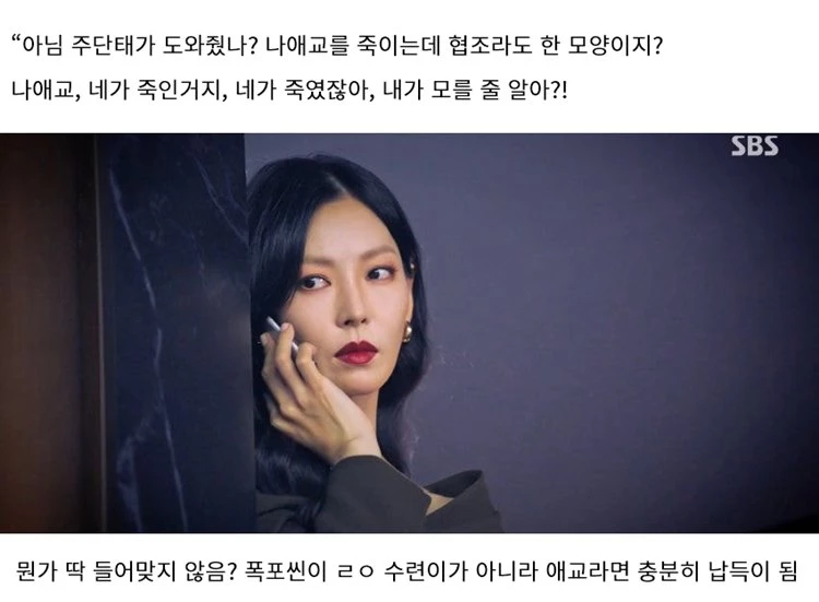 네티즌은 "로건을 나애교로 바꿔봐라. 심수련이 갑자기 천서진한테 '로건 죽였냐'고 물어보고 확신하는 것도 이상하다. 다른 장면에서는 심수련이 '주단태가 죽였다'고 확신하는 장면이 있다. 그런데 갑자기 천서진을 몰아가는 것도 이상하다"고 말했다.