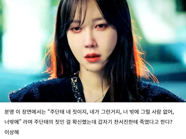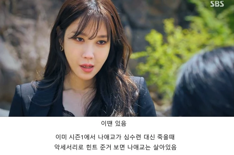 그러면서 "심수련이 천서진 납치할 때 귀걸이가 없었는데 절벽에서 밀 때는 귀걸이가 있다. 시즌 1에서도 나애교가 심수련 대신 죽을 때 액세서리로 힌트 줬는데 이것도 힌트 아니냐"며 의혹을 제기했다.