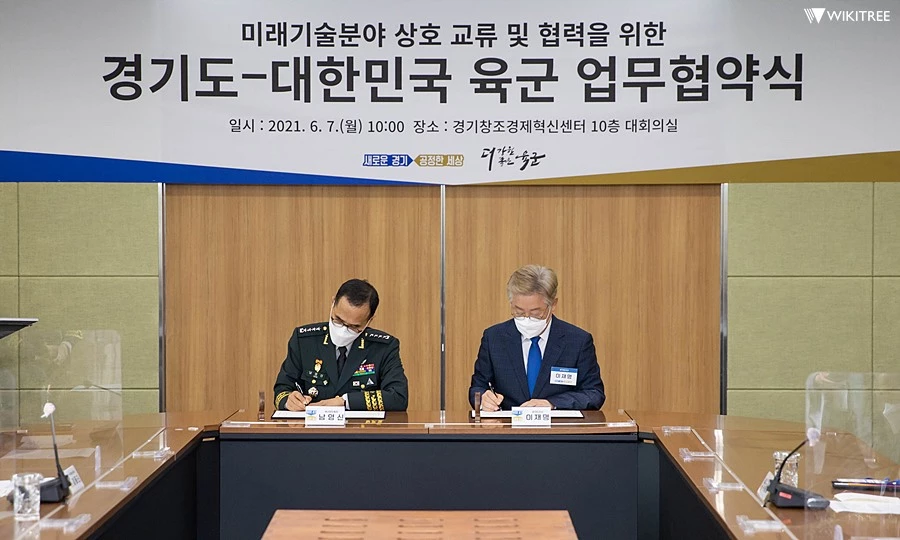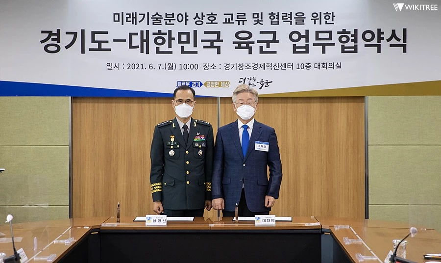 이재명 경기도지사는 7일 성남시 판교 경기창조경제혁신센터 대회의실에서 남영신 육군참모총장과 ‘미래기술분야 상호교류 및 협력을 위한 경기도-대한민국 육군 업무 협약식’을 개최했다. 이 자리에는 박상근 육군교육사령관, 엄용진 육군본부 기획관리참모부장도 참석했다.