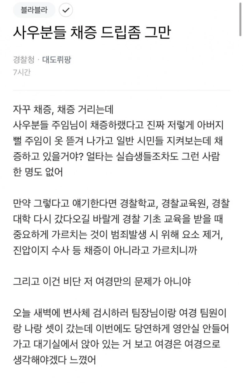 “변사체 검시하러 팀장님이랑 여경 팀원이랑 셋이 갔는데 (여경 팀원은) 이번에도 당연하게 영안실에 안 들어가고 대기실에 앉아 있는 걸 보고 여경은 여경으로 생각해야겠다고 느꼈다.”