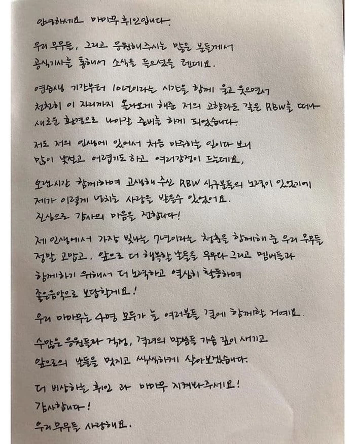 휘인은 12일 자신의 인스타그램에 "휘인으로서도 마마무로서도 좋은 모습 보여드리겠습니다. 응원해 주셔서 감사합니다"라는 글과 함께 자필 편지를 게재했다.
