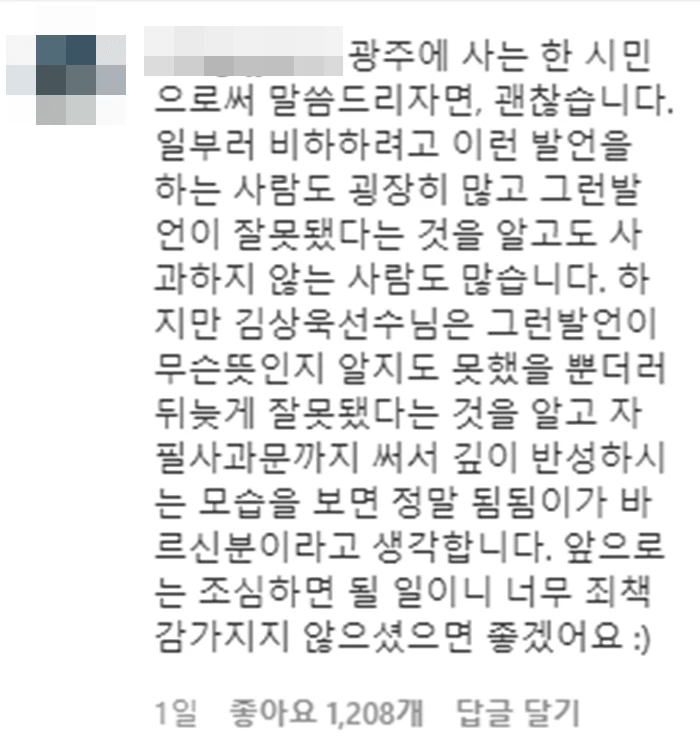 이를 본 누리꾼들은 혐오 단어를 사용해 사과했던 다른 셀럽들과는 다르게 김상욱의 진심 어린 자필 사과문에 응원의 메시지를 남겼다.