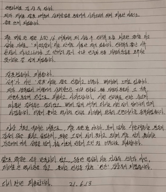 그는 "며칠 전 열린 AFC 16 대회에서 제 시합 후 인터뷰 도중 화끈한 경기를 하고 싶었다는 의미로 '피떡갈비'라는 단어를 사용한 적이 있다"라며 "인터뷰가 끝난 이후 시간이 지나고 나서야 그 단어의 뜻이 5·18 민주화 운동 희생자분들을 모욕하는 뜻이라는 걸 알게 됐다"라고 해명했다.
