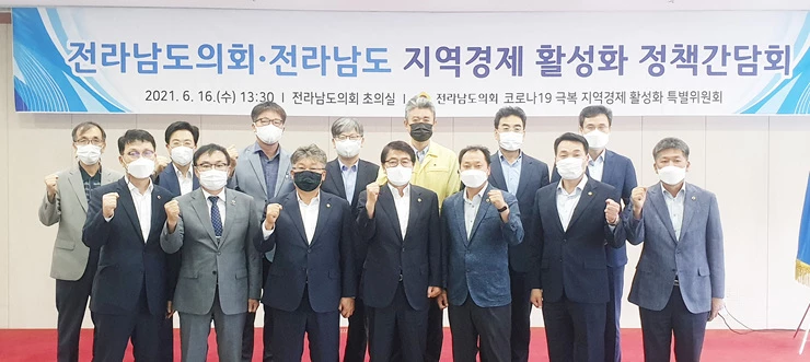 전남도의회 ‘코로나19 극복 지역경제 활성화 특별위원회’(위원장 김태균, 광양)는 지난 16일, 도의회 초의실에서 전남도 등 유관기관의 중소기업·소상공인 지원정책 추진상황 등을 점검하고 신규 정책을 발굴하고자 ‘전남도의회·전남도 지역경제 활성화 정책간담회’를 개최했다.