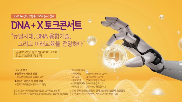 호남대학교(총장 박상철)는 국내외 최고의 신기술 전문가들을 대거 초청, 오는 6월 23일 오후 2시부터 호남대학교 IT스퀘어 1층 소강당에서 ‘뉴딜시대, DNA융합 기술, 그리고 미래교육을 전망하다’를 주제로 DNA+X 토크콘서트를 개최한다.