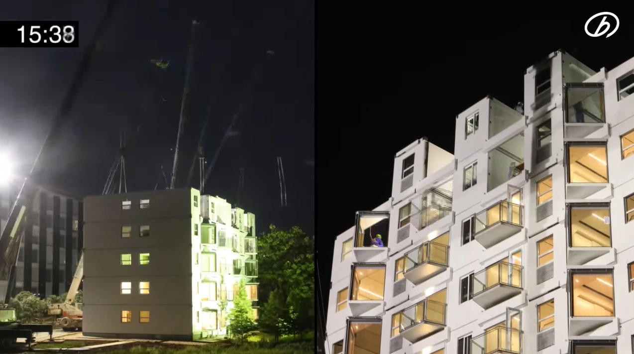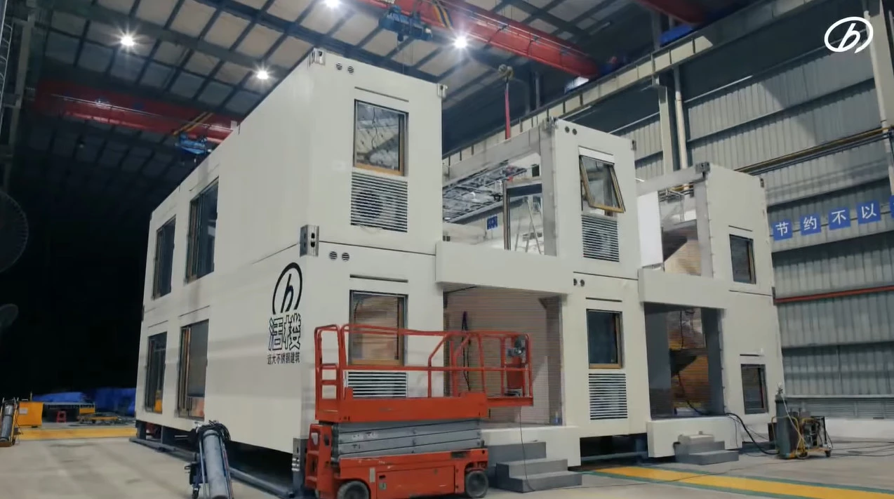 영상에 따르면 업체는 이미 2009년부터 공장에서 강철 건물을 개발했다. 모듈식 조립 세트로 만들어 운반과 설치가 쉽도록 설계했다. 현장에서는 세트를 옮겨 차곡차곡 쌓은 뒤 나사로 고정한 다음 전기와 배관 공사 등만 진행하면 되도록 했다.