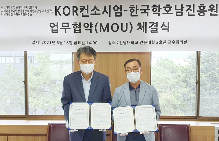 전남대학교 국문학과, 지역어문학기반 미래인재양성단, 한국어문학연구소로 구성된 KOR 컨소시엄은 지난 6월 18일 한국학호남진흥원과 지역 문화 연구와 교육 프로그램 확산 및 상호발전적 교류사업 추진을 위해 업무협약을 체결했다.