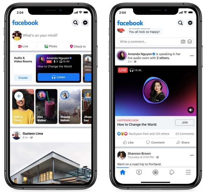 페이스북의 라이브 오디오룸은 기존 페이스북 앱 내 뉴스피드에서 바로 이용이 가능하다. 새로운 라이브 오디오룸의 알림을 받거나 음성 게시물을 확인할 수 있다. 별도의 앱이 필요하지 않다는 간편함이 라이브 오디오룸의 가장 큰 장점이다.