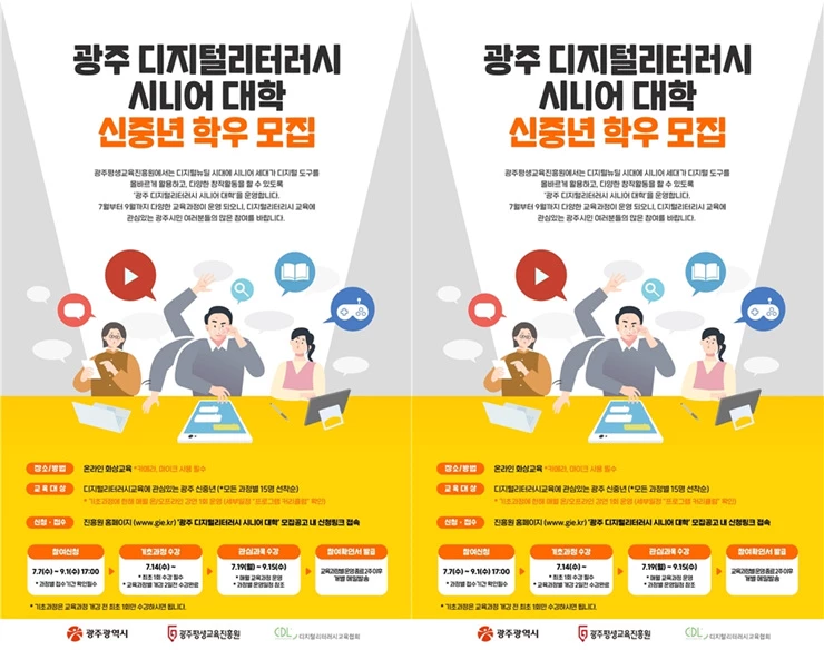(재)광주평생교육진흥원(원장 김이겸, 이하 진흥원)은 오는 7월부터 광주에 거주하는 신중년 및 시니어를 대상으로 ‘광주 디지털리터러시 시니어 대학(이하 시니어 대학)’을 운영한다고 밝혔다.