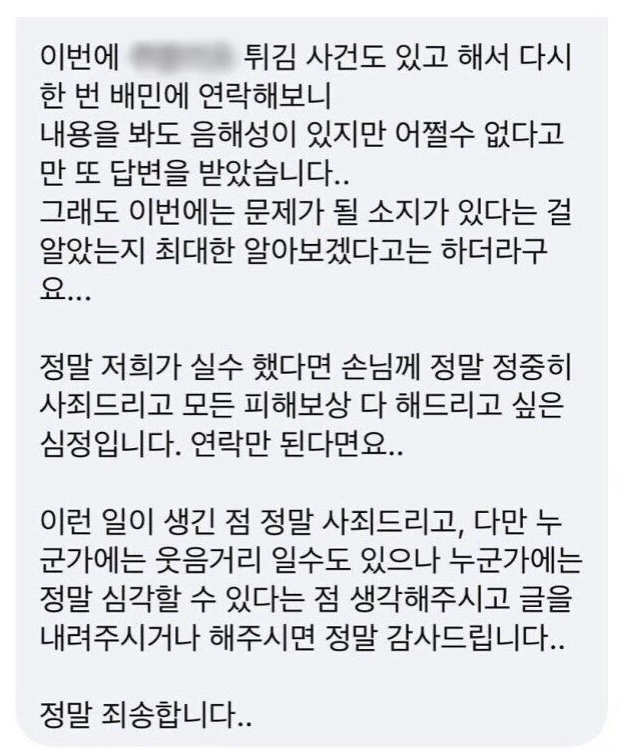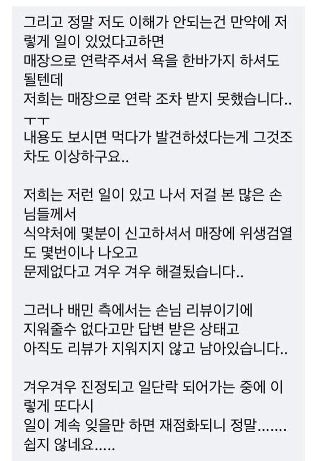 사장은 'XXXX 새우튀김 사건' 이후 다시 배민에 연락해보니 '내용을 봐도 음해성이 있지만 어쩔 수 없다. 그래도 최대한 알아보겠다'는 답변을 받았다고 털어놨다. 다만 "매장 측 실수라면 손님께 다시 정중히 사과드리고 싶다"고 말했다.