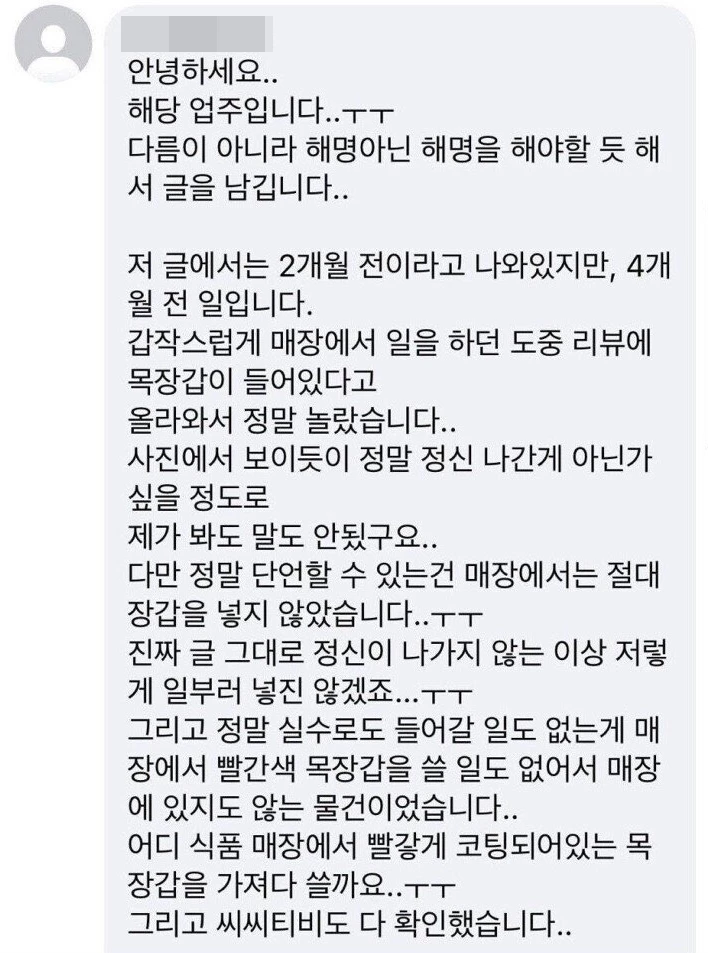 사장은 "4개월 전 일이다. 일을 하던 도중 음식에 목장갑이 들어있다는 리뷰가 올라와서 정말 놀랐다"며 "제가 봐도 말도 안 되지만 정말 매장에서는 절대 장갑을 넣지 않았다"며 억울해했다. 그러면서 "실수로라도 그럴 일은 없다"며 "CCTV로 확인해도 문제가 없었다"고 주장했다. 또 "손님들께서 식약처에 신고해 매장에 위생 검열이 몇 번이나 들어왔지만 문제가 없었다"고 해명했다.