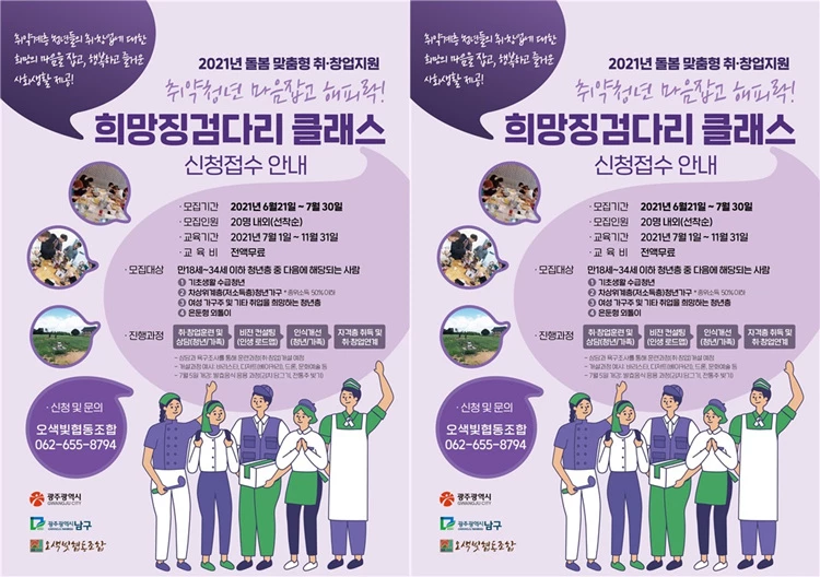 오색빛협동조합은 광주광역시에서 진행하는 '2021 희망징검다리클래스' 남구청 협력기관으로 선정되어 ‘취약 청년 희망 ! 마음[心] 잡[JOB] 고[GO] ~ 해피락[樂] Ⅲ’을 진행한다.