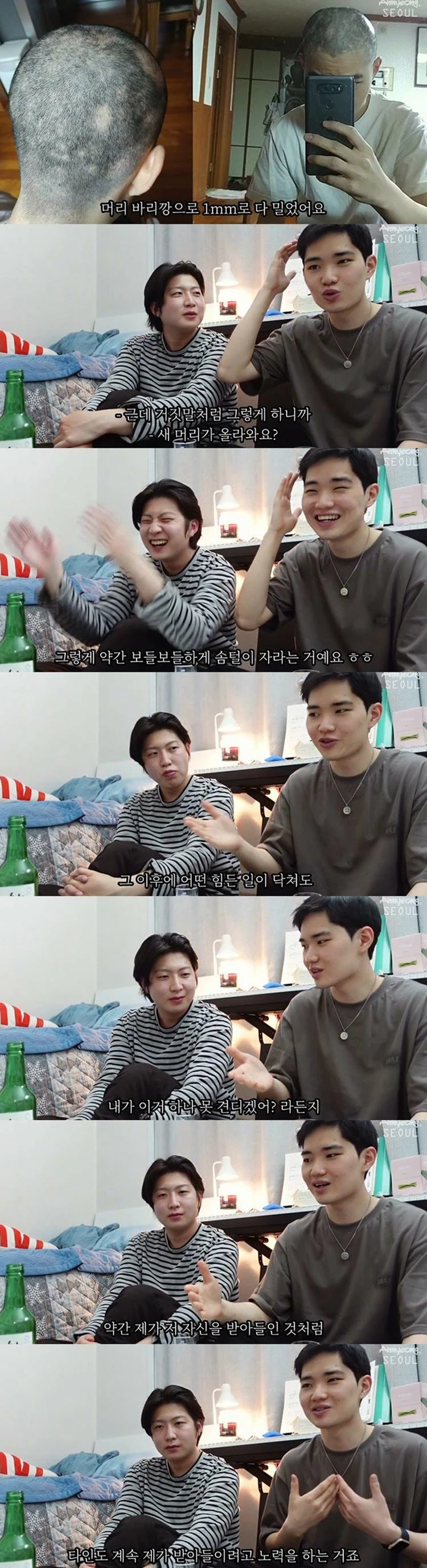 청년은 "그러다가 마음 속 스트레스를 모두 내려놓기 위해 대머리로 살기로 했다"면서 "그렇게 머리를 모두 깎고 나니 거짓말처럼 새머리가 솜털처럼 올라오더라"고 전했다.