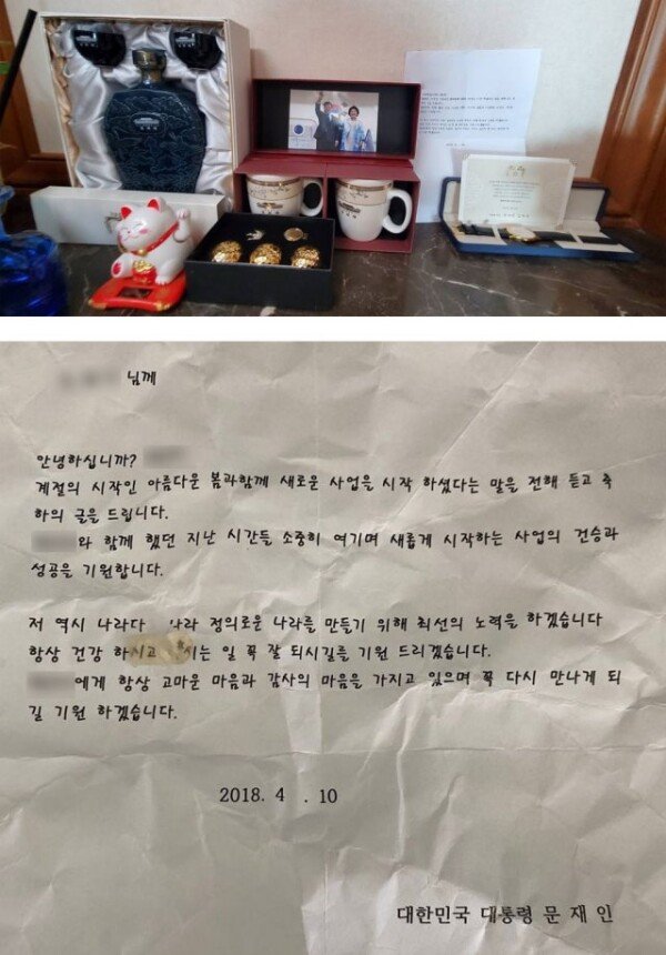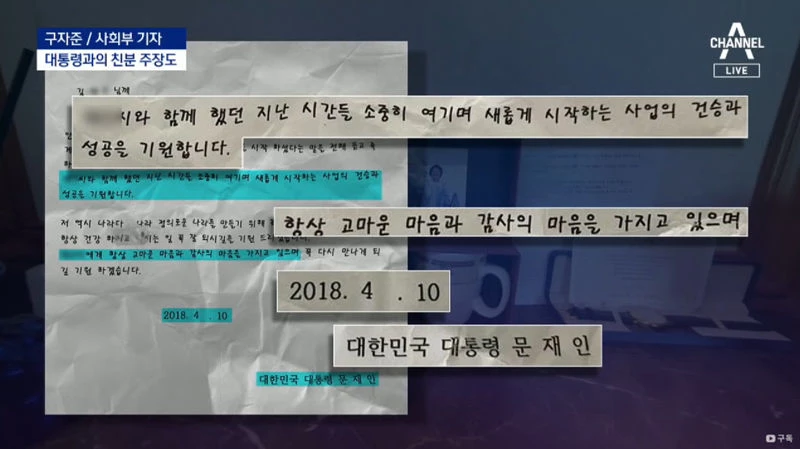 특히 이런 과정에서 그는 문 대통령이 직접 썼다고 거짓말한 “사업의 건승과 성공을 기원한다”라는 내용의 가짜 편지와 문 대통령의 사진, 청와대 문양이 새겨진 술병과 술잔, 머그컵, 시계 등을 자랑하며 자신의 뒷배경이 ‘든든’하다는 식으로 가짜 인맥을 자랑했다고 한다.