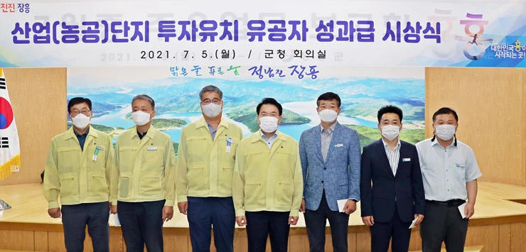 장흥군(군수 정종순)은 지난 5일 군청 회의실에서 산업(농공)단지 기업 투자유치에 기여한 유공자에게 성과급을 시상했다고 밝혔다.