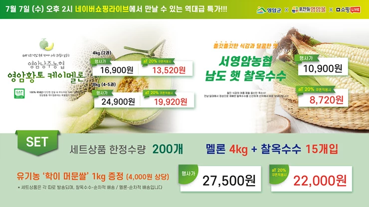 또한, 세트상품인 멜론+햇찰옥수수 구매시 유기농 쌀 1kg(4,000원 상당) 증정하며, 방송이 종료된 후에도 기찬들 영암몰과 남도장터, 네이버쇼핑에서 추가로 7월 9일(금)까지 판매할 예정이다.