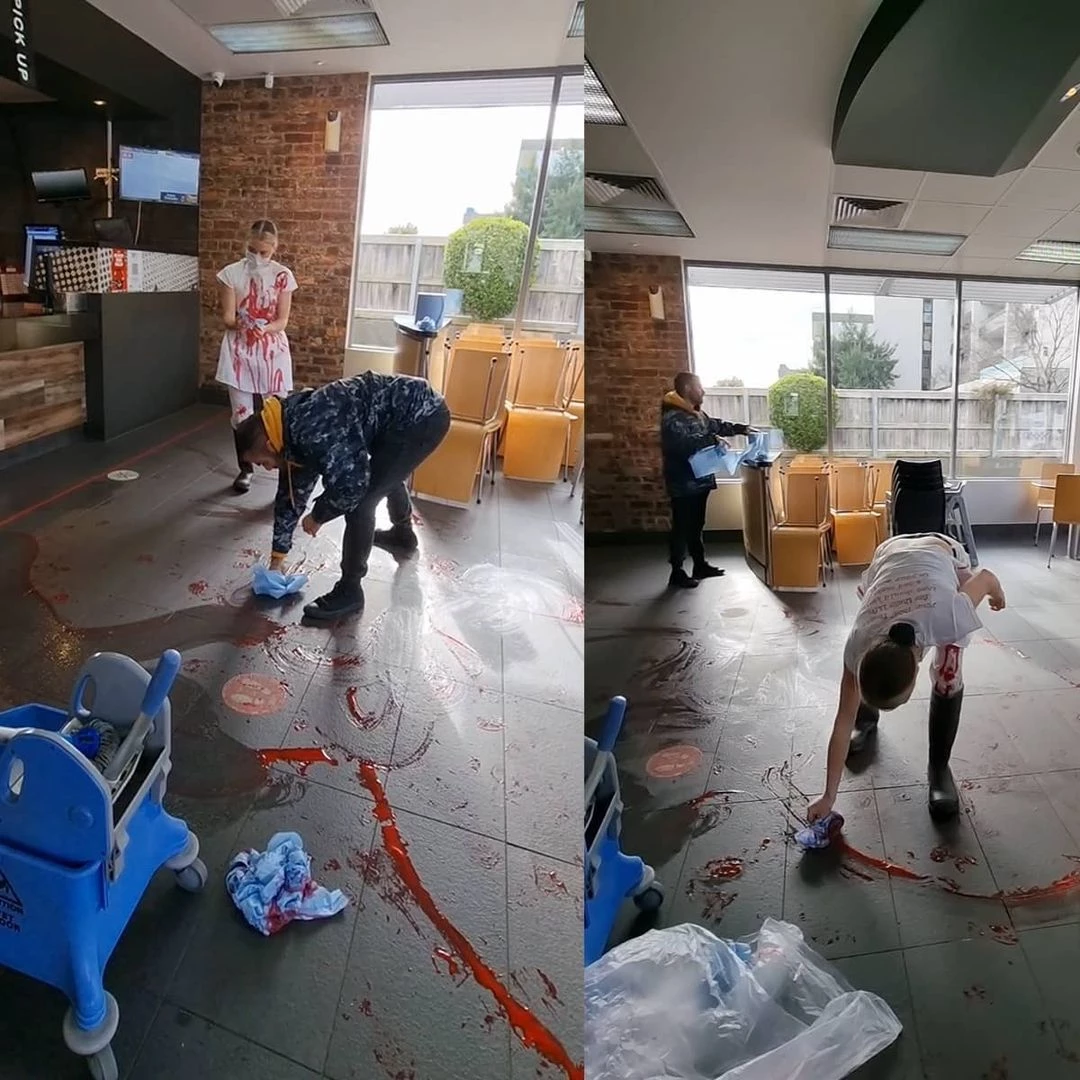 호주의 한 극단적 채식주의자 모임이 패스트푸드점에서 과격한 시위를 펼쳐 논란이 되고 있다.