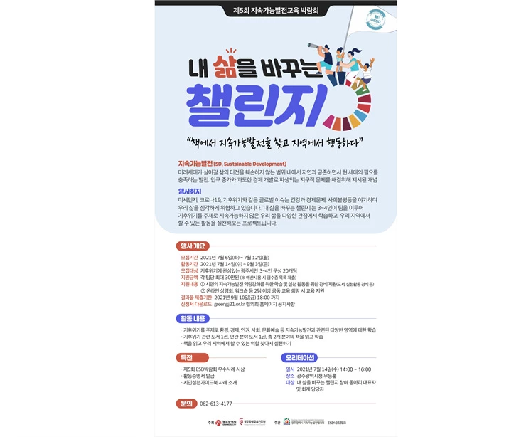 광주광역시(시장 이용섭)는 광주지속가능발전협의회, 광주평생교육진흥원과 공동으로 대면·비대면을 병행한 ‘제5회 지속가능발전교육(ESD) 박람회’를 오는 14일부터 9월3일까지 개최한다.