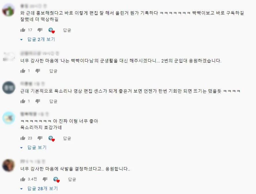 해당 사실을 접한 네티즌들은 반가움을 표했다. 그들은 "홍보해줬다고 바로 편집 잘해서 올린 거 뭔가 기특하다. 더 떡상하길", "이 형 너무 좋아. 목소리까지 호감이다", "언젠가 한 번 기회만 되면 뜨기는 떴을 듯"이라며 트미를 칭찬했다. 또 "나는 빡빡이다 님의 군 생활을 대신해 주시겠다니...", "너무 감사한 마음에 삭발을 결정하셨다고.. 응원합니다" 등 재치 있는 댓글을 남긴 네티즌도 있었다.