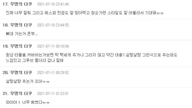 해당 영상은 유튜브, 온라인 커뮤니티 더쿠 등에 퍼졌다. 해당 영상을 본 네티즌들은 "윈터 뼈대가 진짜 가늘다", "살랑살랑 추는데도 춤선이 너무 이쁘다", "진짜 여리여리하다", "저런데 또 키는 크다. 164다"라며 댓글을 남겼다.